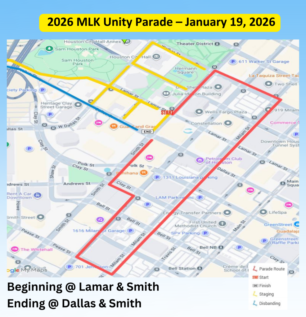 A: The parade will be held on Monday, January 19, 2026, in Downtown Houston. The official route map will be announced soon.